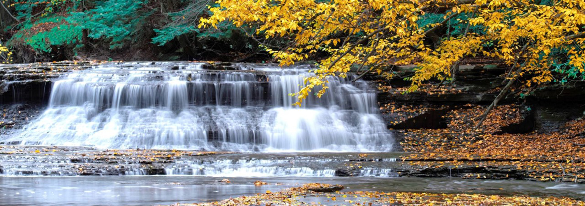 First off Jay, you have done really well capturing your original image and then processing it and presenting it to us in this format. Others have mentioned the balance of the image, and they are quite right. Down here we have a landscape photographer of international renown. Take a few moments and google Ken Duncan. He's an iconic guy and does a lot of panoramas in 6x17 format (from the old days of roll film). I hope you don't mind, but I have applied the 6x17 format to your image, and nothing else. I mean nothing by it, but by loosing some of the leaves in the top of the image and some of the rocks in the foreground, personally I think nothing of importance has been removed. In your image the falls themselves make up less than 20% of the scene. By cropping it to this format take up more area of the scene, while there is still enough of the supporting elements to provide season and location. And a question, do the falls now "appear" more centered? I haven't touched the vertical boundaries at all. I hope you don't mind my playing around with your image and look forward to your thoughts. |