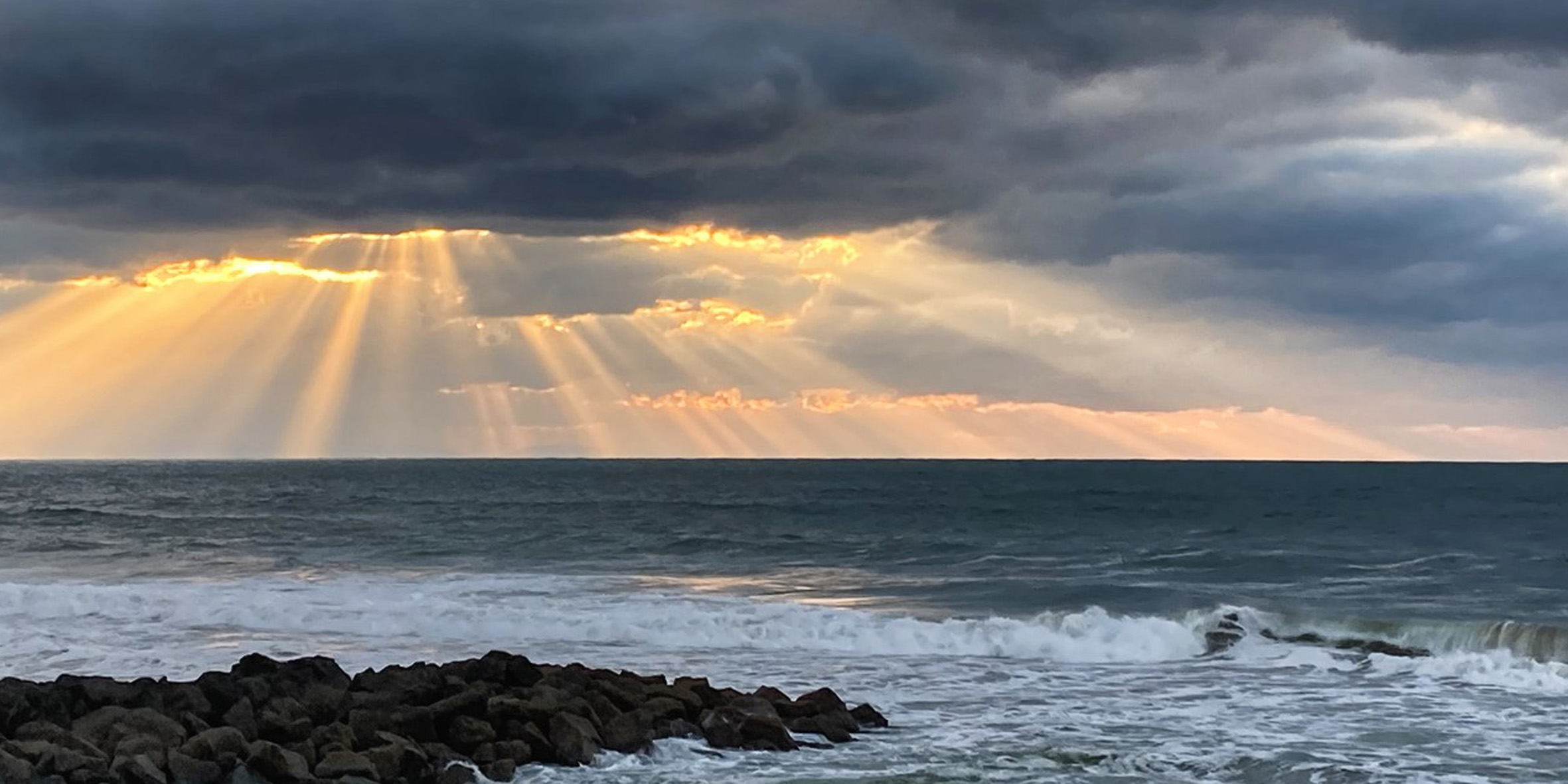 Congratulations on a superb image Sophie. I fully agree with Henriette, the best camera at any given moment, is the one in your hands. Your exposure to maintain those heavenly light rays is perfect, while still showing detail in the clouds and water. I hope you don't mind, but I have just cropped it some, as suggested by the others so far. In my humble opinion, if you just take out some of the sky, the horizon is too central for my liking, so I have just taken a very little off the bottom as well, just to drop the horizon down from the middle a bit. Others may say it's still too high, but I didn't want to take too much of the rocks and water away. Regardless Sophie, this is an image to be proud of. |