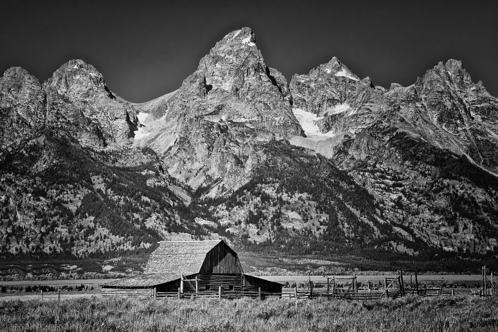 A fine image Butch. You mention your preference to include clouds, but with this one, is there enough sky to include any here? The sky is maybe 20% of the overall image and the story in this image to me, is all about age. The old timber barn and the ancient mountains in the background. A cliche? Possibly. To make"your cliche" different, why not try a B&W version? Back in the 50s, that's all they had, and how many great and memorable photos are from those days. So I had a play in Nik Silver Effects. I chose the neutral filter and knocked the brightness down to -10; upped the contrast to +25 and upped the structure to +10. Just for a "different" option. |