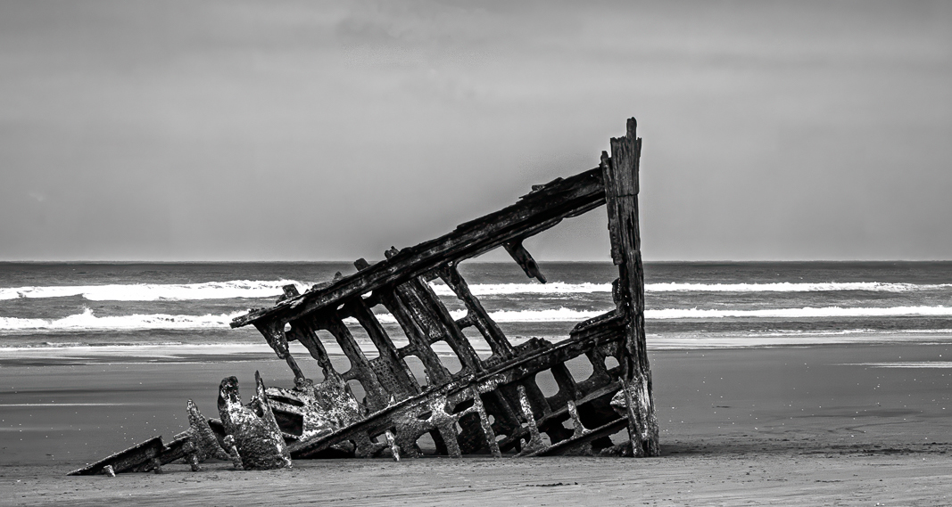 This is a very strong image Lauren, well seen and processed. You ask for our thoughts about the level of contrast you've applied. In my opinion, it's absolutely great. It emphasizes the harshness or grundgyness (if there's such a word) of the shipwreck's remains. My only minor concern was that the sand in the very bottom also went along for the contrast ride. To me it competes with the shipwreck for the viewer's attention. I hope you don't mind my playing with your image and just removing that bottom area of sand to leave the good ship Peter Iredale taking full and center stage. I didn't mean it to become a pano, it just happened that wat because I didn't want to touch or loose any of the sky. |