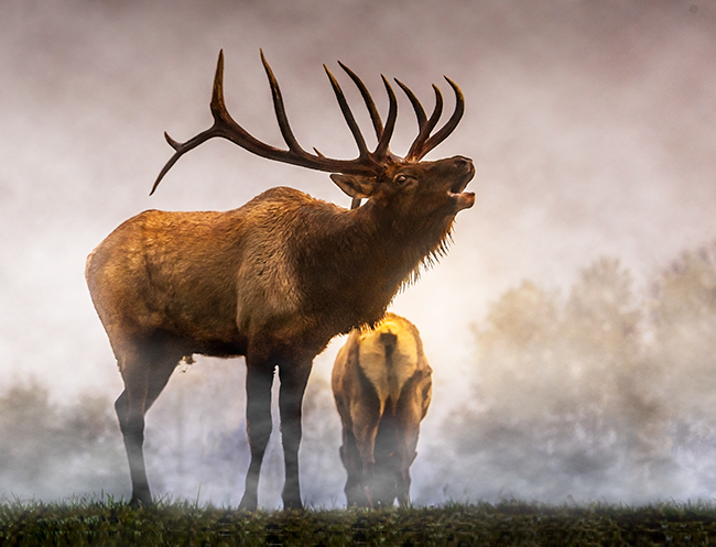 Thank you for the comments Brenda and Mervyn, this was taken before the sun rose in the early morning in the thick fog. While lightening, shadow recovery, sharpening and clarity would enhance a daylight image where these things would occur naturally, the mood and feeling of this time of day and weather condition would be lost in my opinion. I could have edited to enhance the foggy feel which might have made the image read better to intent. It was suggested in a pro wildlife critique group that I remove the cow since she is faced in the opposite direction. Funny though, she was receptive to his advances and allowed the bull announcing his joy to the competition to mount her right after this image. Unfortunately, they did this deed both facing away from the camera. That is a lot of story impossible to convey in this image though. |