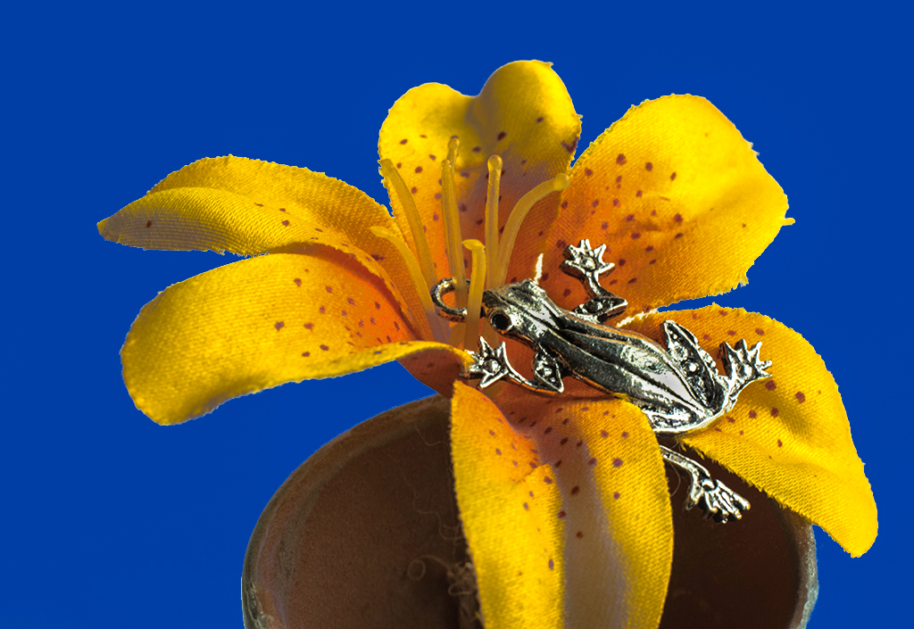 Lovely photo you have here. A very pleasing composition, nice diagonal with the frog and leaf on the sinister (upper left to lower right) diagonal. The color balance with the yellow, orange and terra cotta pot go well together. You did accomplish your stated goal of showing structure of the flower and the bead frog with nice clarity.