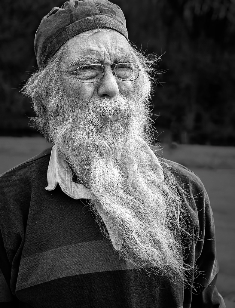 You commented that the monochrome shot doesn't have the appeal of his beard, hat, and shirt after the conversion. You also said you thought the photo works reasonably well in both color and B&W. I think the man in the B&W has more character and looks more classic than in color shot where his beard shows more golden tones and doesn't seem as crisp. In color shot the eye has a lot to see from the blue shirt, the white collar is whiter than his beard, and there is a red stripe at the bottom that tugs at the viewers eye keeping it off the center of attraction, the beard.