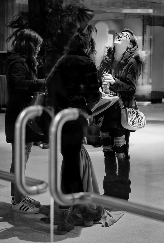 Yes, I agree the man should go-I can't think of a reason to keep him in the shot. The reflections are tough to work with, but there are some options. Maybe next time if you use a polarizer turn the filter to equalize the reflection from the glass. This may all be easier said than done as I know you usually only have seconds to get the shot on the street.