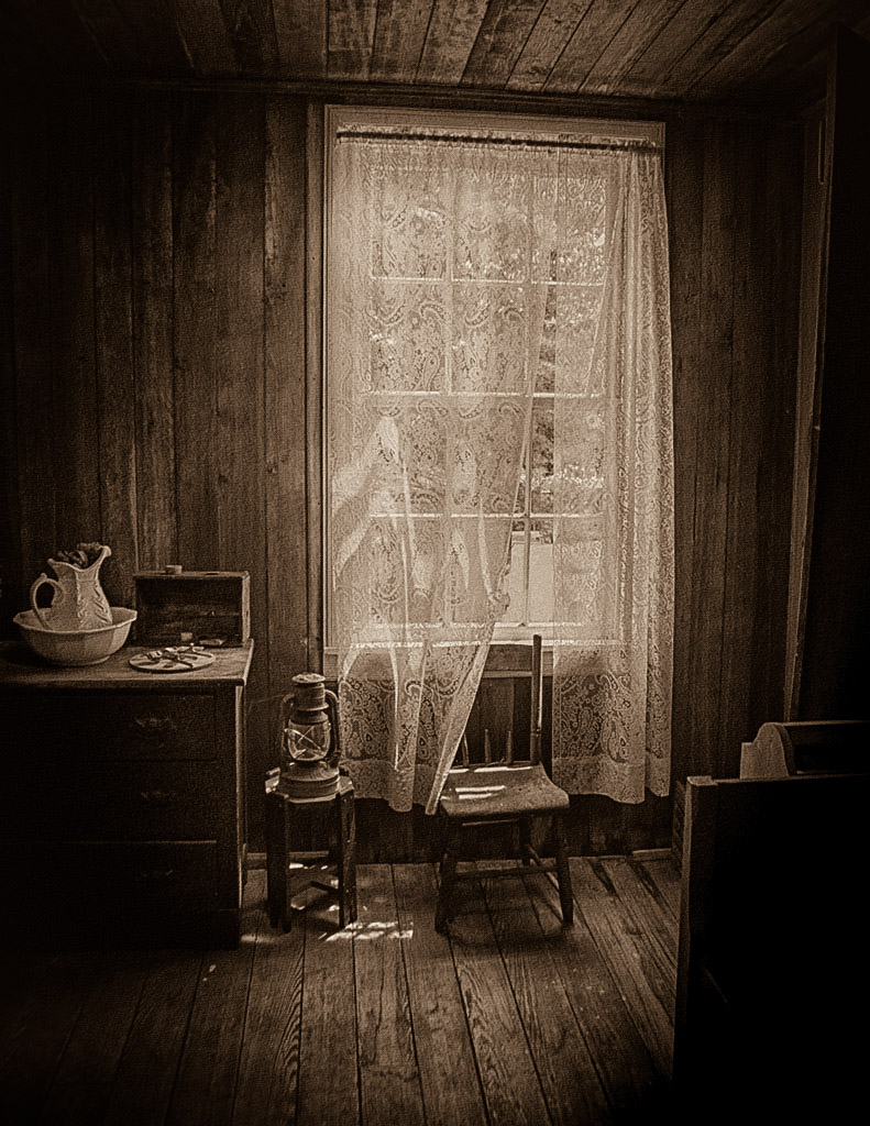 You say it's not a good image but I think it is a snippet in time of a place someone called home. It's beautiful with the simple charm of an uncluttered room that has just the right amount of elements, bed, light, chair, wash basin, and curtain. What more could one want?