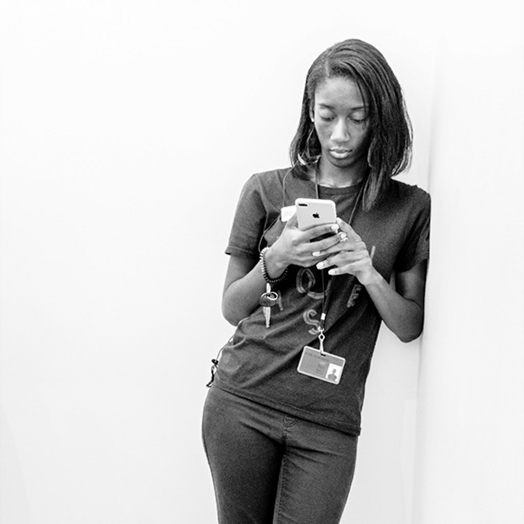 I like this photo, Oliver! I love the simplicity. It gives the viewer a chance to get to know the subject. You have an opportunity to examine and find out more by observing what she is doing. I cropped it in a 1:1 ratio and I think it makes it easier to really see what she is doing and to notice the key and card she carries. I also took Hattie's advise and darkened the clothing. I checked the histogram, and it was pretty flat in the blacks to midtone area so adding some black may have helped-this is a personal preference.