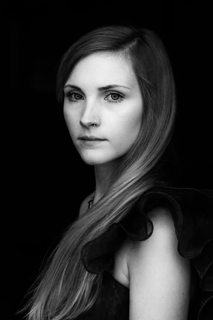 I like your models pose, you positioned her at a good angle. I see ample room on the left so Gemma looks comfortable in the frame. I like having her hair over her left shoulder because the highlights bring a nice tone to an overall dark image, along with giving my eye a path to her face. I also like the ruffle of her sleeve as it helps tell a story of elegance. I can't help but wonder when looking at Gemma if she is going to a ball or a very special and beautiful event.