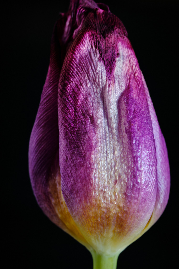 My composition consisted of a white foam core board for a bounce card set to the left of the flower, a bottle with a tulip in it in the middle, and my flash pointed at the flower from the right side.