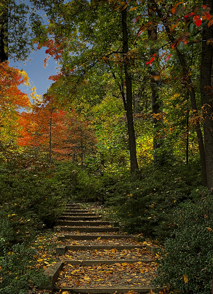 I have to agree with everyone here that the scene is very inviting, the color palette tells a lovely story of the fall season, and the stairway is very inviting to a viewer to want to walk right into the frame.
