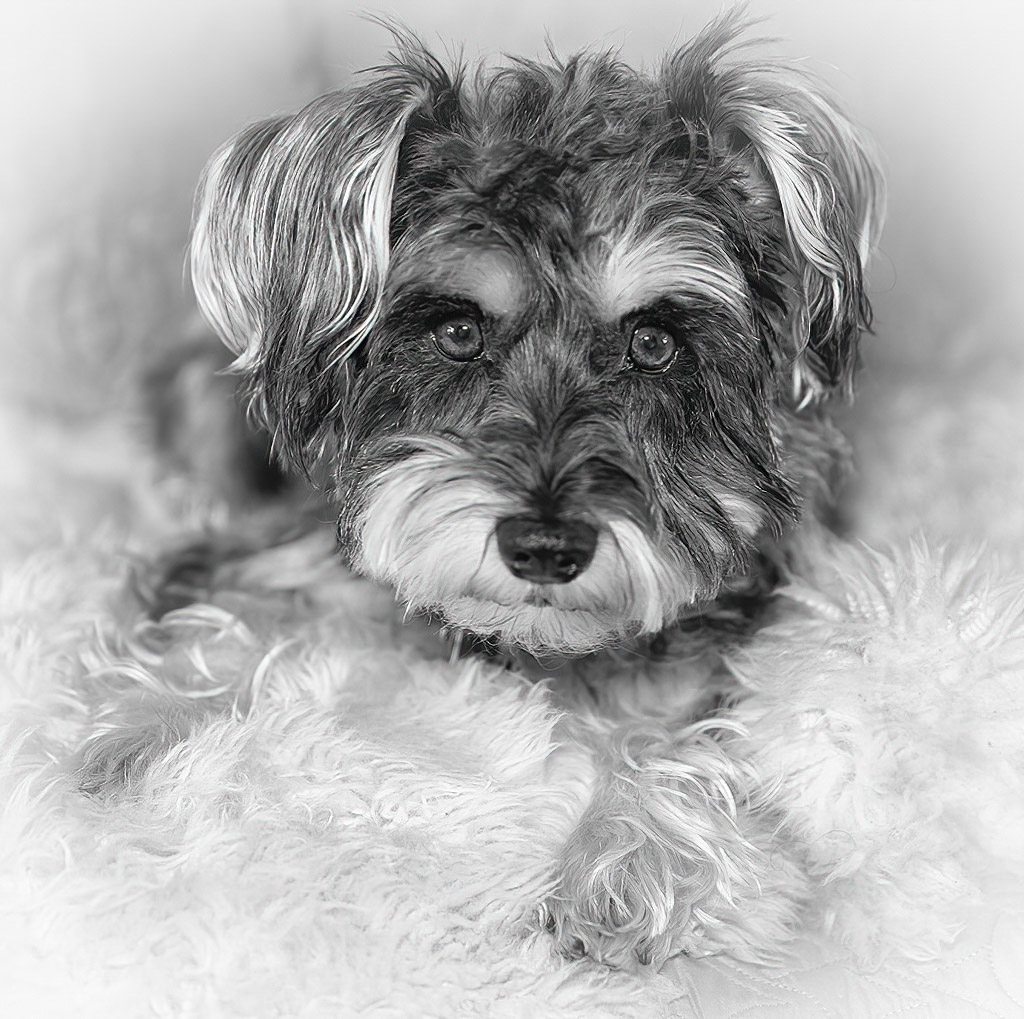 What a beautiful dog portrait, and, yes, Hello Cinnamon! You did an excellent job capturing this photo, and the monochrome conversion works very well. The dog's eyes are sharp, and there is a texture in the hair that makes me want to reach into the image and pet Cinnamon. The white fuzzy blanket gives contrast to help the dog stand out. The highlights are well under control! Bravo!