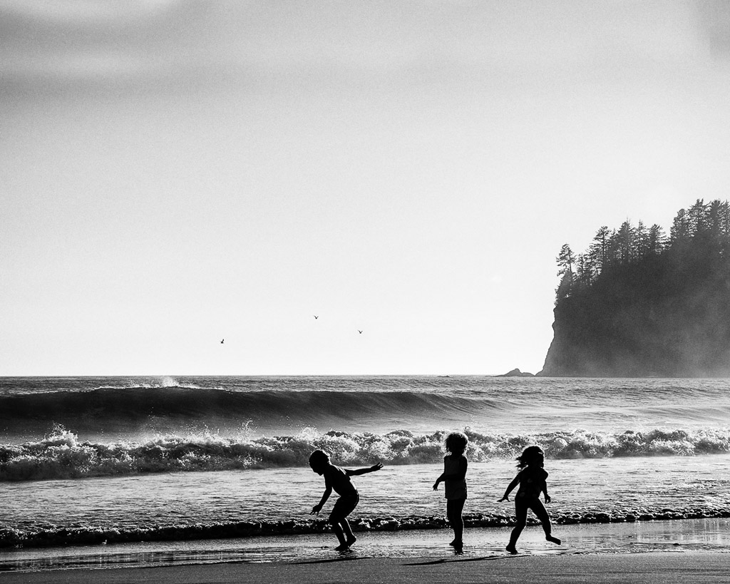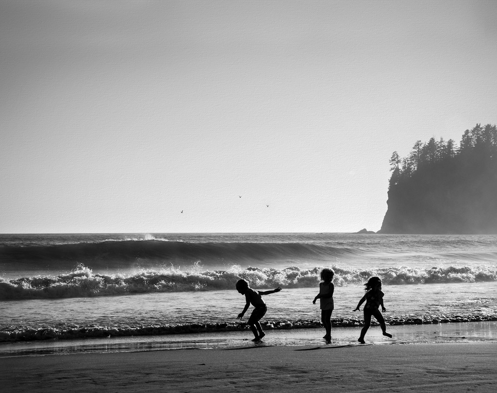 My image example I did in Silver Efex Pro. I selected the high structure - smooth preset, lowered the grain slightly but left some in the sky area as the sky is very plain, so there is a little vignetting and grain. I also had to add a third bird to complete the rule of odds in the photo. Lastly, I did a small crop bringing the bottom of the frame up to the kids' shadows.