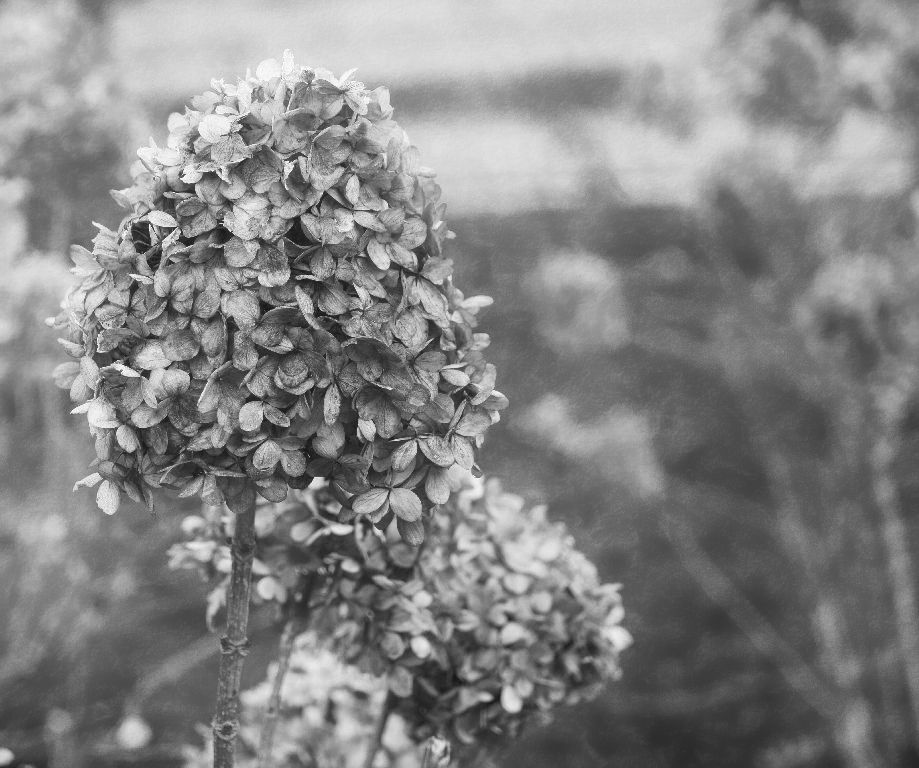 Lovely hydrangea photo. An incredible flower that can be dried and last for quite a while. The image shows a nice left to right diagonal as well as a golden spiral from the large bloom circling down then up to the upper right corner of the frame.