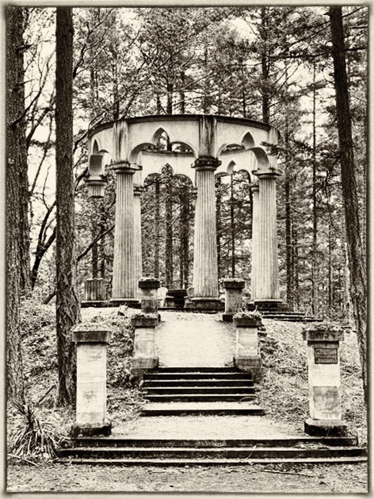 I have limited experience with the antique tones in monochrome photography, so this image has inspired me. I like your point of view; it feels like I could walk right up into the area. I now notice the broken pillar! When I first saw the scene, it appeared to be busy with all the surrounding vegetation. But with the yellow-toned monochrome editing, the business is under control and not a distraction. The walkway is well positioned, and the light is good. I think the darker background and the trees in focus allow the mausoleum to stand out and conform to the style of the finished edit chosen. The pillars are light and stand out for me, so I would not change anything there.