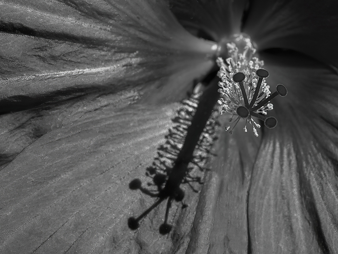 I love your Hibiscus flower photograph in black and white! It is difficult to capture the beauty of a flower in black and white; we are so used to seeing them in vibrant, rich colors nowadays. But you have found a great way to bring out the beauty in this macro/close-up of the stigma. Your crop looks like it fits the golden ratio rule. I like the lines and texture on the petals leading to the subject.