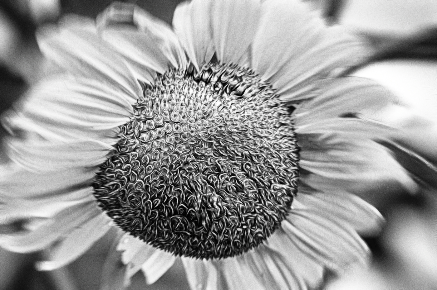 In my edit, I first converted the color photo in Nik Analog Efex Pro 3 using the Motion 6 preset. I played with some of the settings to keep the center of the flower in focus while adding motion to the petals. Next, I went to Topaz Studio 2 and used the Cuddle Critter preset with Screen for opacity. I selectively added the texture to certain parts of the flower and varied the intensity in other areas. There is a small amount of grain; I happen to like grain because most people don't choose to use it.