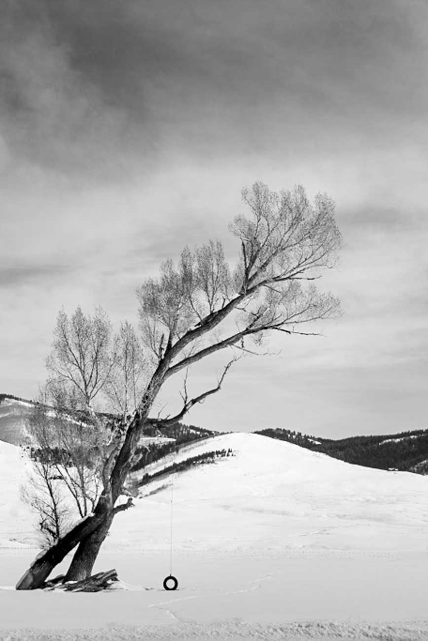 When I looked at your photo and read your description, you noted," I was intrigued by the tire swing, which was partially buried in snow and strikingly dark against all the white snow." I based my edit on that information. I used the original photo to edit and simplify to bring out what you noted in your statement about the scene. Regarding using a vertical crop, I have learned over the years that vertical subjects look better in vertical formats. You are a landscape photographer, and I can see why you chose a horizontal format because that is consistent with that style of photography.