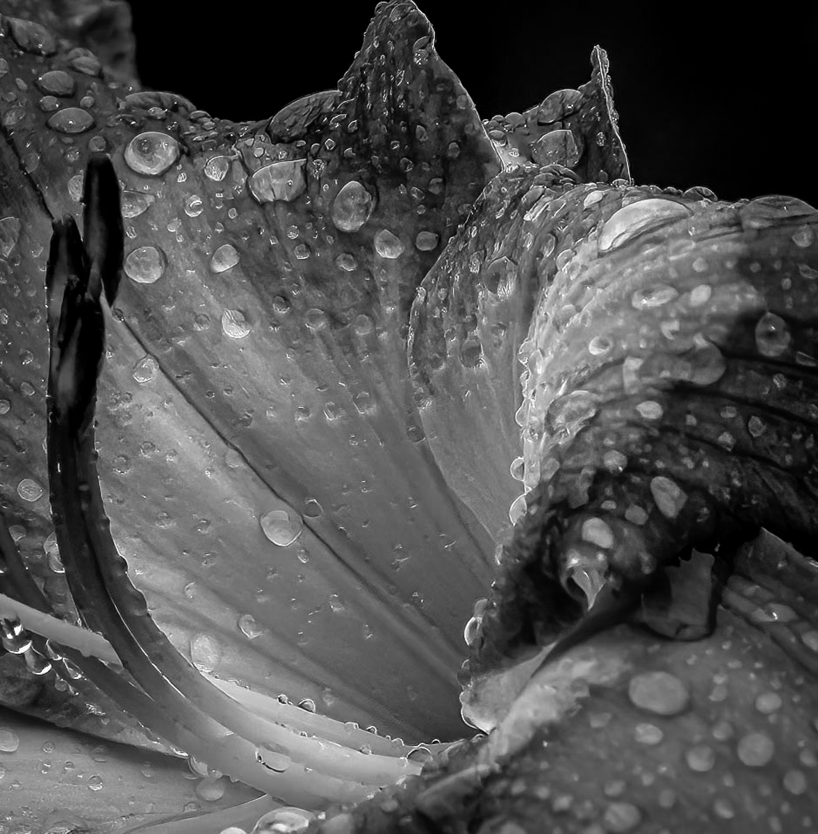 I take it your reason for registering this scene on your digital sensor was to capture the raindrops. The soft focus of the drops in the foreground allows my eye to drift to the back of the bloom, where I can investigate the many organically shaped drops of water.