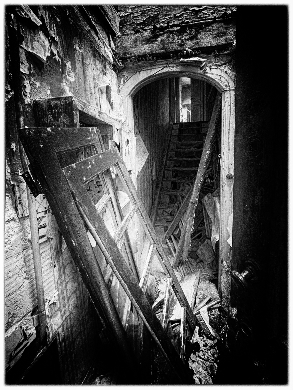 Great image; I love the character of the weathered look; there is a lot for a viewer to see in this image. I do like your idea to draw the eye to the stairway. The natural daylight is also perfect for telling this story of abandonment and decay.
