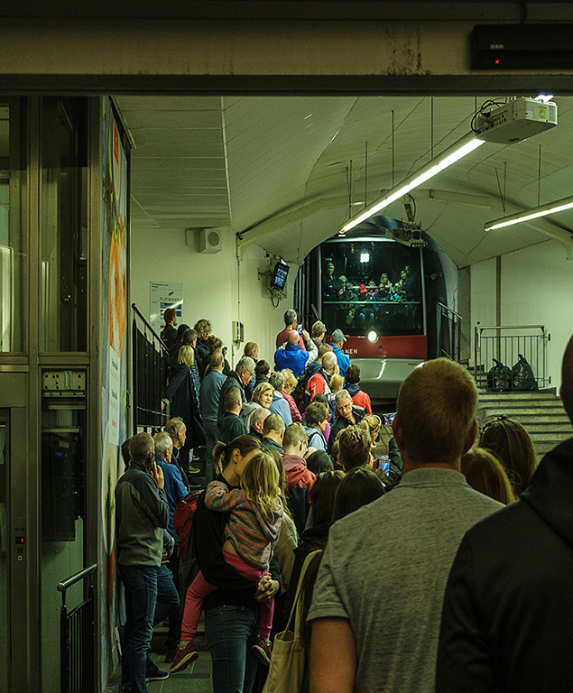 I like the story the photo tells us. The lighting and color tune looks good to me. The cable car and the people make the the photo live. I would try remove portions of the elevator to see if photo is better focused. |