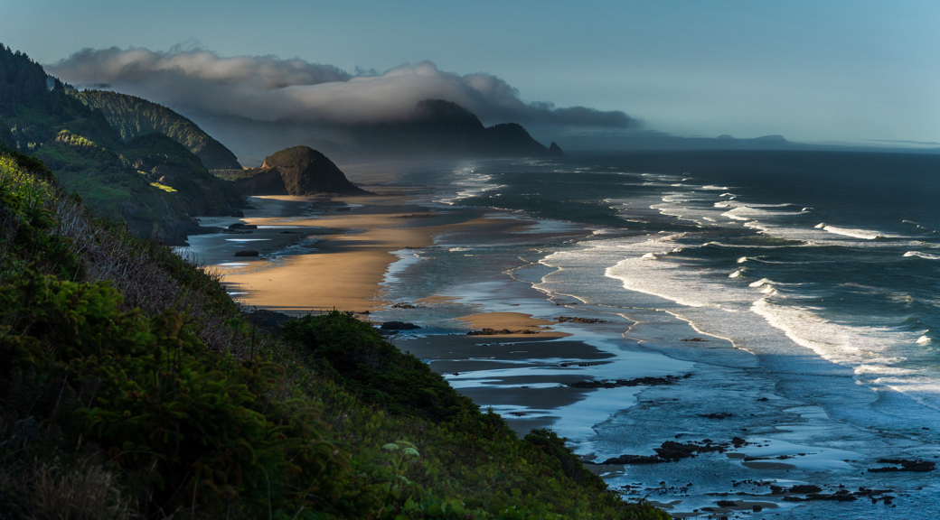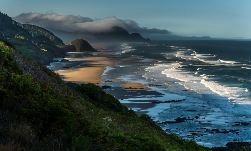 It's a beautiful shot. I like the waves as a leading line, the lighted beach, and mountain range with clouds. I would try to crop off some bottom portion to see if it looks different? |