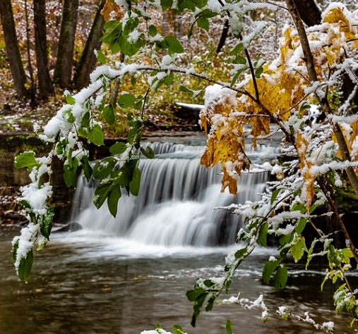 I agree with Fred. A tighter crop would help. I find myself distracted by the tree trunks on the right. The exposure is perfect to capture the foreground colors and get the silky smooth water flow. The curvature of the tree branch is a key feature for me so my suggestion id something like a square crop. (see pic) |