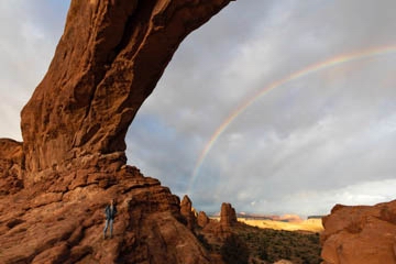 The guy is important to add scale. I'm not sure about the rainbow drawing the eye out of the image. Maybe flipping the image helps that?