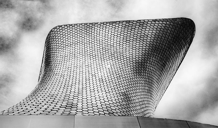 I really really like this image. I think it's very cool that you took the time to clone out the extra building as well. I love all the little lenses all over the building. However I wonder if the color adds or distracts from the main image itself which I feel is the design of the little lenses. I downloaded the photo and quickly came up with something like this using NIK Silver Efex Pro to illustrate a bit of what I was talking about. |