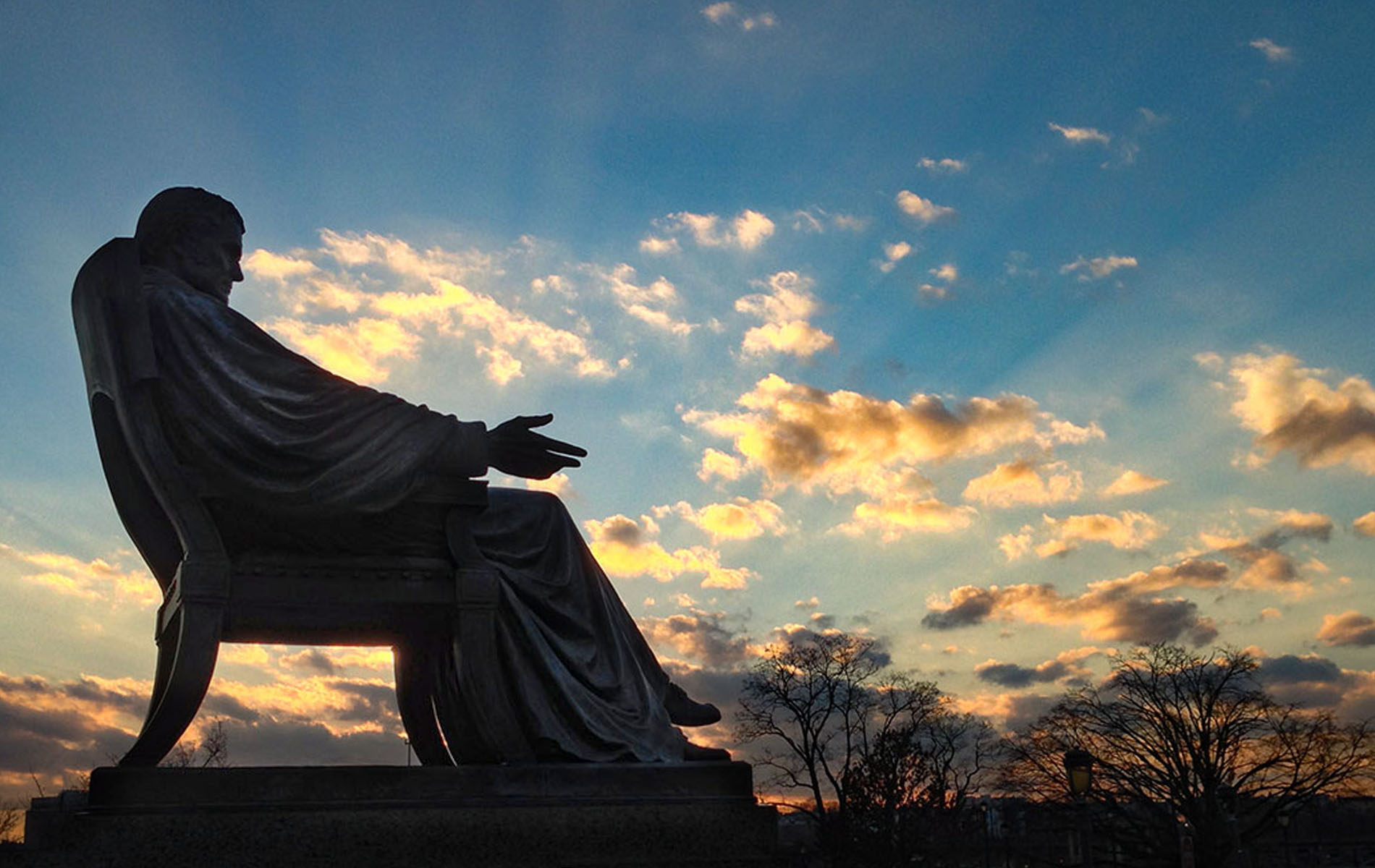 I love the idea of it. Wish there was some way for the viewer to know who it is without being told. I love the rays of light, lovely. I would like to see less sky, also the horizon straightened. I fooled around with it and added a layer mask to lighten the statue so we could see more of the details of him.