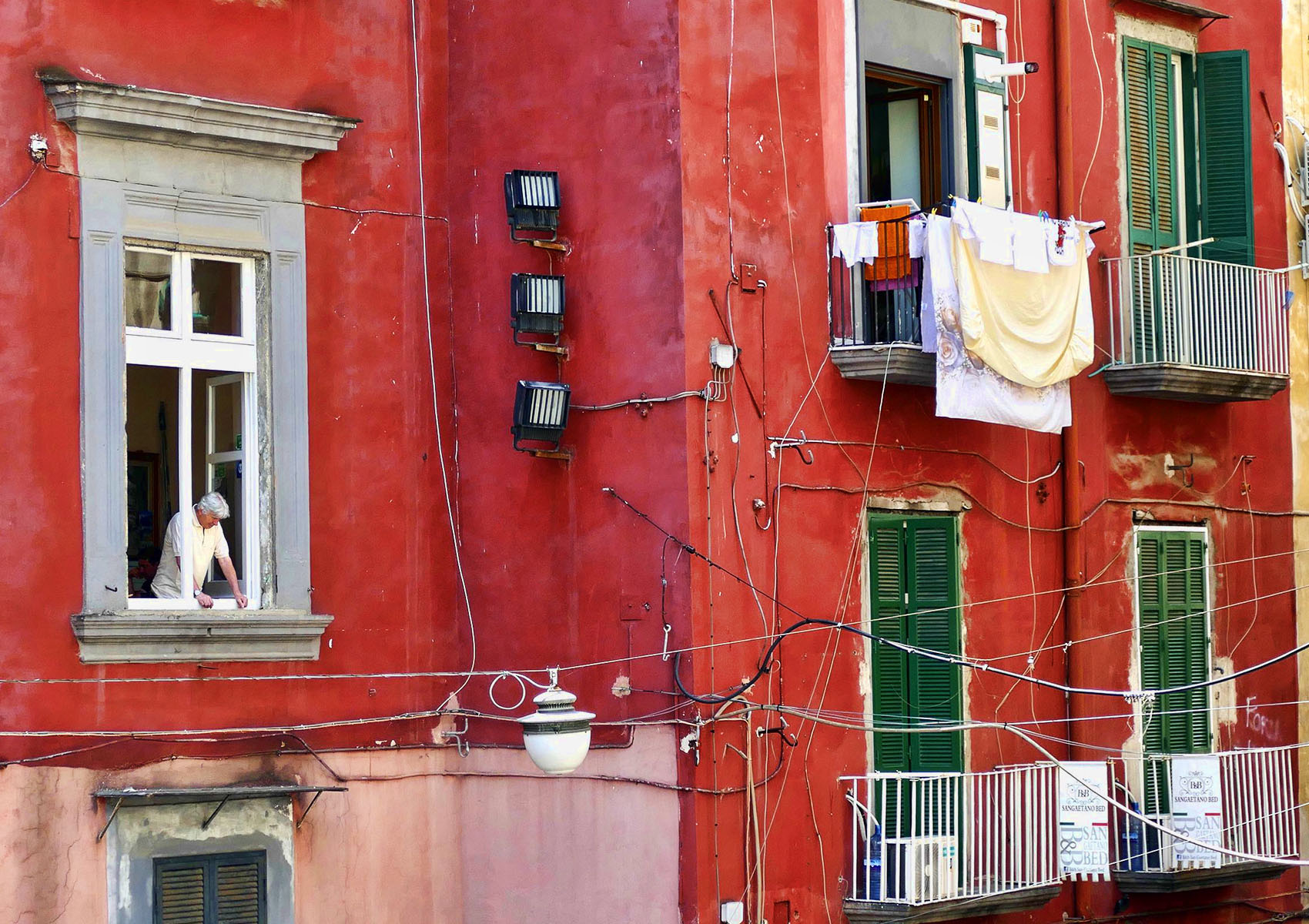 This image has so much to look at - so I didn't really notice the man that much until you pointed him out in your description. I wish the man wasn't wearing White ! Can you paint his shirt red or some other color ? He needs to stand out better. Also I'd crop off some of the top and left side. I'd saturate the color of the building just a bit, but that's just a personal preference.