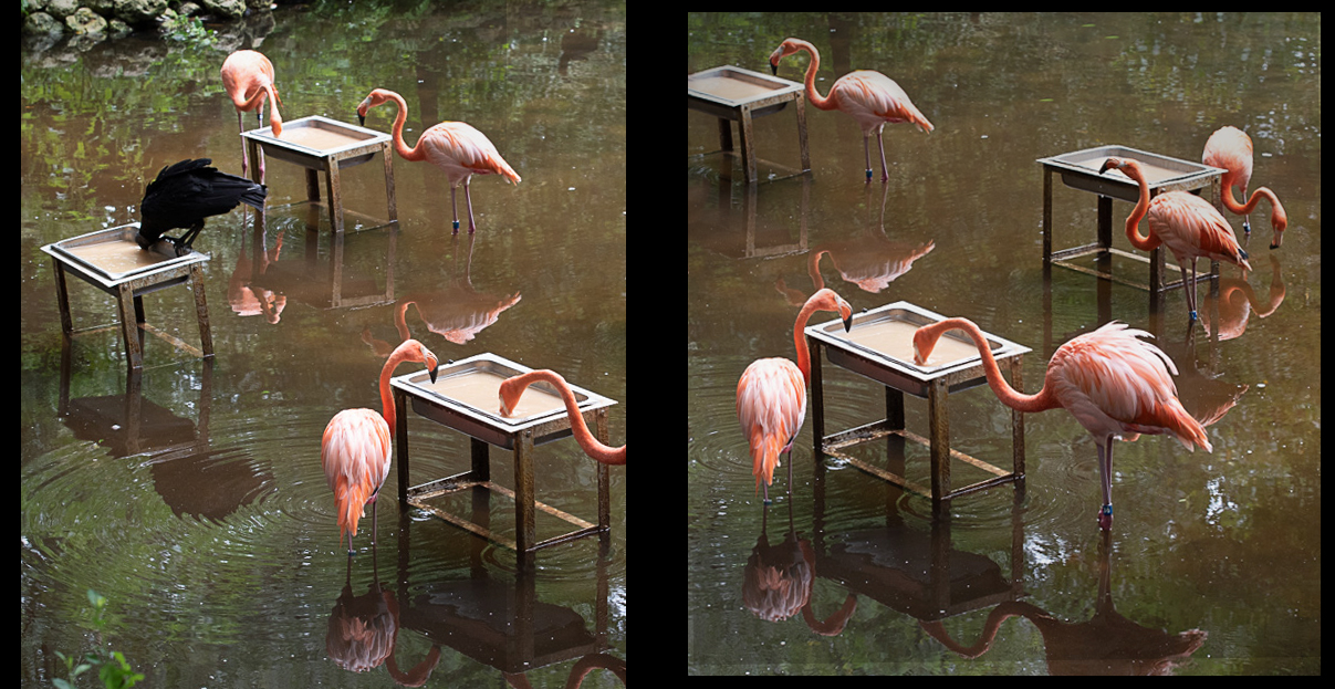 Cecilia -This is a difficult photo for me. I find the "hand of man" -- all the non-nature bits - distracting and not particularly pleasing, though the flamingo colors and all the water reflections are nice. You clearly liked including the vulture (though I'm thinking it looks like a large crow to me) and the story of him muscling in adds to the image. I feel there's just too much happening in this photo, so I tried making it into two photos, each with a cluster of three feeding stands. Mostly I straightened the photos, cropped and vignetted. If the flamingos are sharp (I can't tell) and there's a catch-light in some eyes that's a plus.