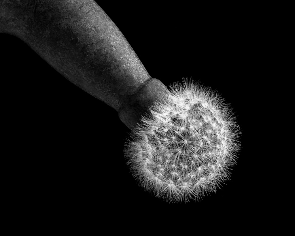 Bunny - this is a wonderful image with great detail, texture and tonal range. I especially like the contrast between the well-worn bottle texture and the sharp brilliant dandelion. Here's a flipped version that has the light coming from the top, and makes the subject look manly.
