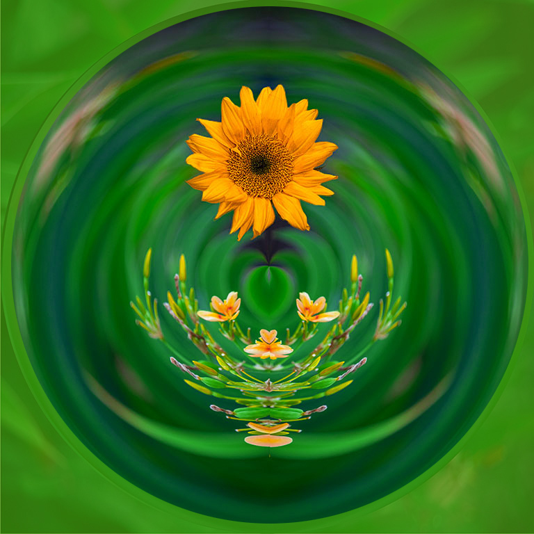 These sorts of images sure are fun to play with, and the added dimension of the overlaid sunflower is a plus. To keep the image centered I often (partially) darken or modify the color of the area outside the sphere. As for the sunflower, it was a good idea, but the lighting doesn't quite seem to mesh up. To help I tried a 3-strip lookup adjustment layer, and then a levels adj layer on the sunflower part, with some partial brushing in.