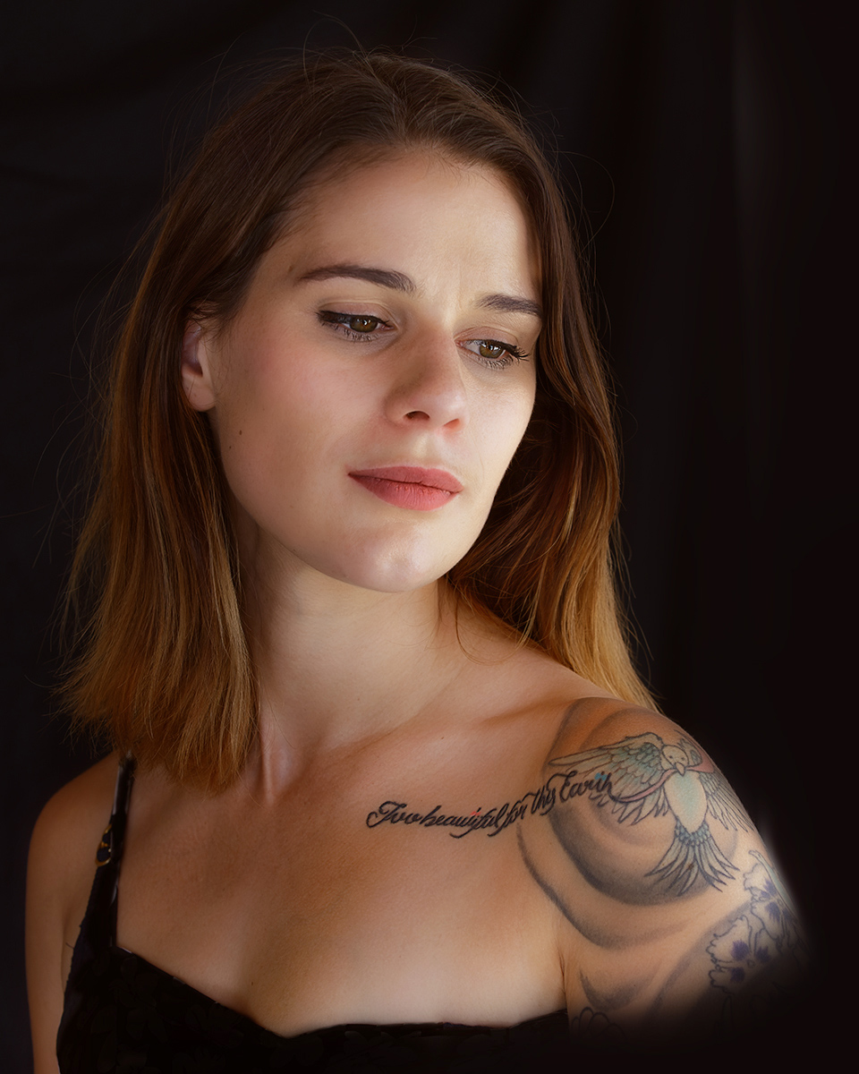 Although the window light was really nice, I think it could be enhanced. I tried lightening the black places in her hair and digitally adding a hair light to the top of her hair to better separate Jess from the background. Also added some light on her bodice. For this version, I used two separate levels adjustment layers at reduced opacity in PS, with masks.