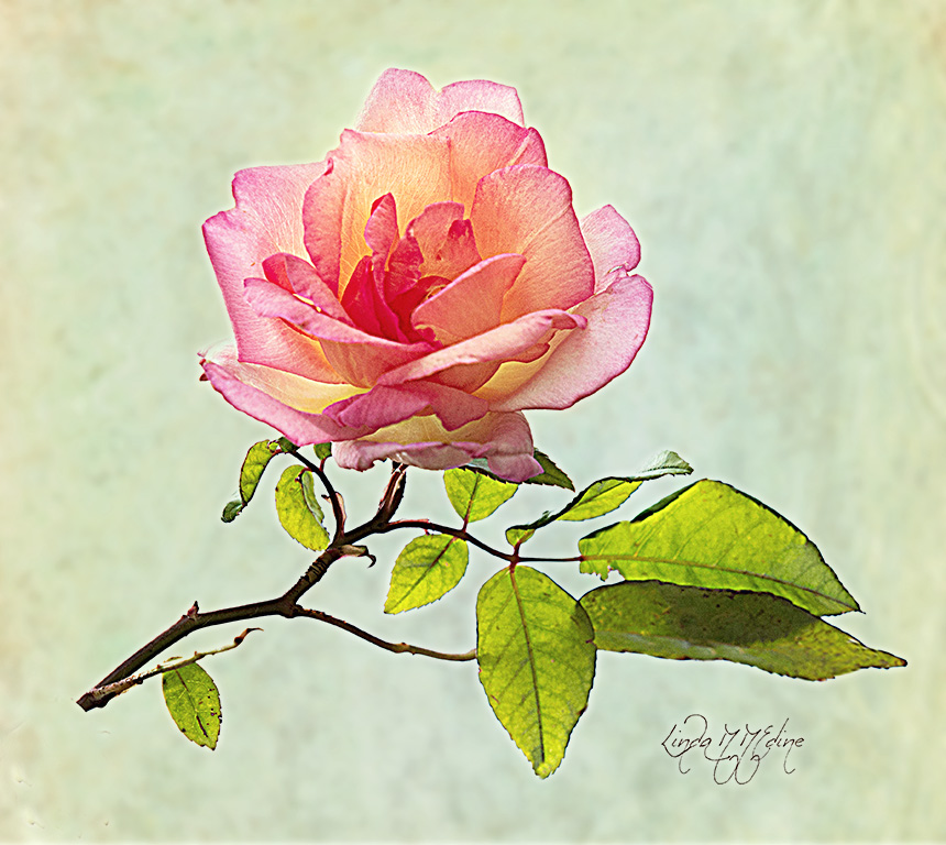 In this version, I used a much simpler and more muted green texture (actually a blurred texture). I added the yellow to the rose using a soft large yellow brush on a separate layer, then changing to the overlay blend mode. |