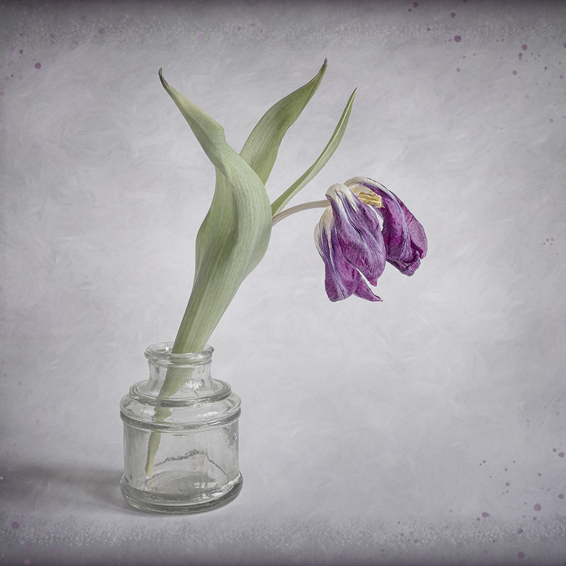 Carol, I love how this faded processing adds quite a bit of interest and emotion to this tulip photo. I especially like the paper-like result on the purples, and the tonal range and texture on the background and photo edges work well. The purple paint dabs were an interesting idea, but in my opinion they draw the eye to the edges, so I might reduce their opacity some more. The highlights on the vase are strong and pull my eye, seemingly making the vase itself the subject.