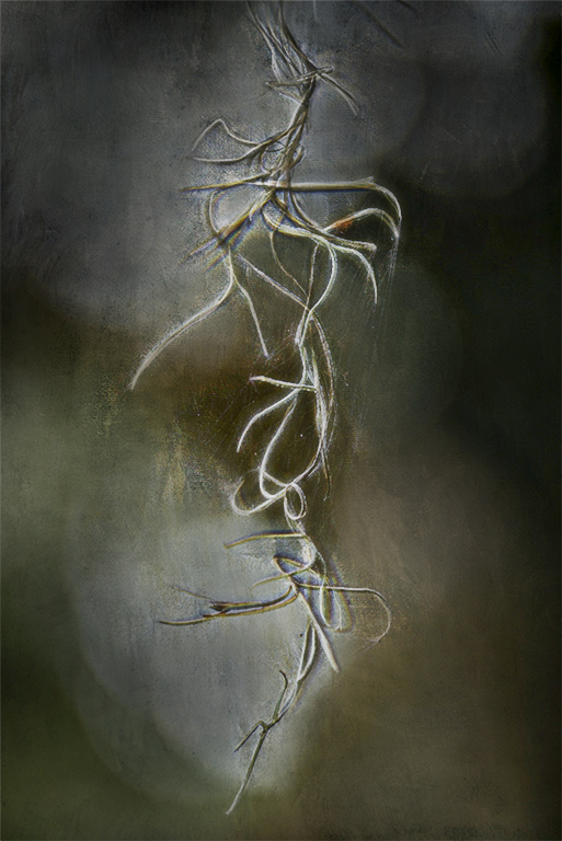 Linda, I can see why you were attracted to this hanging moss with its dangling shape and many branches. On the other hand, its location and limited separation from the background makes it a difficult subject to enhance. Your processing has added some moodiness, but the image histogram stops at the tonal mid-point; there is a lack of lights and whites. I tried to selectively add contrast to the moss using several high-pass sharpening layers, and then masking out the sharpening from the background. The result looks sort of OK on this small image, but it would require a lot of detail work for a print version.