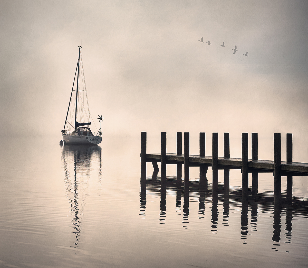 This is a lovely, relaxing scene that would work well on a wall. I like the added geese in the fog.