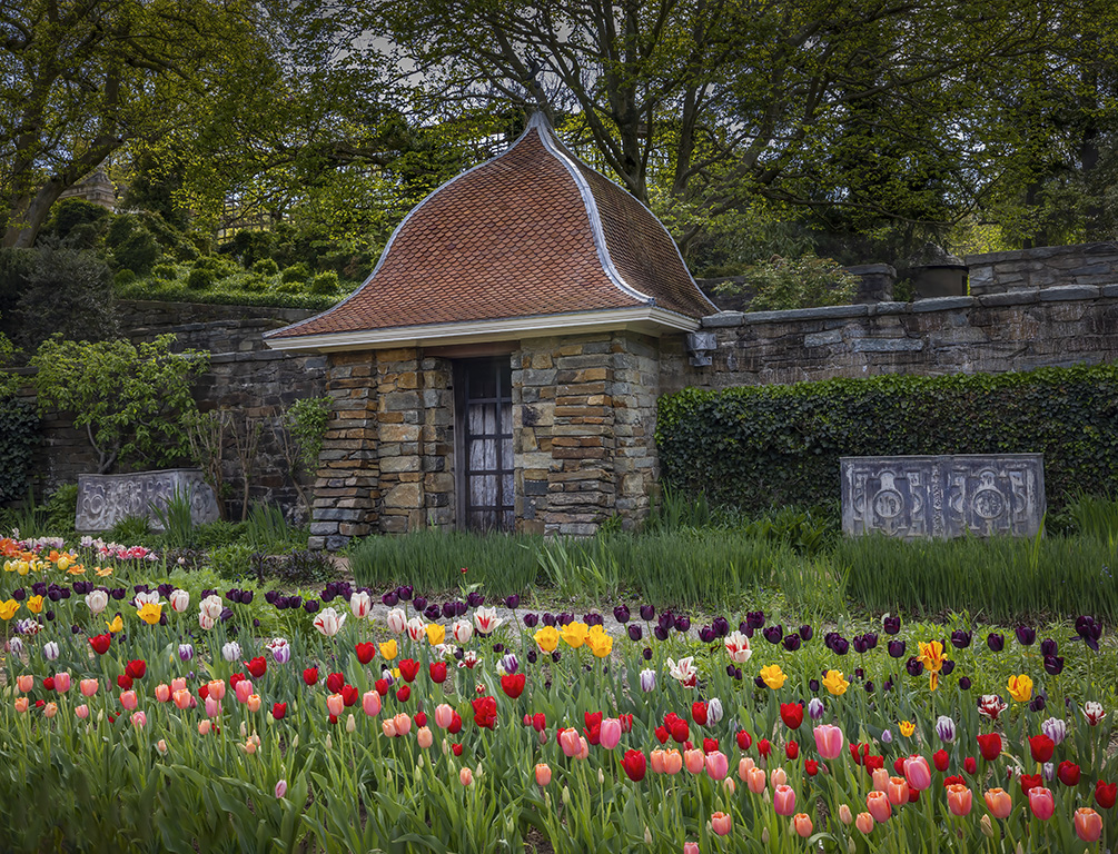 Oliver, lovely peaceful place. I like how you caught the sunlight on the upper level garden and down below on the tulips. Your post-processing is very good. I see the chair in the original.