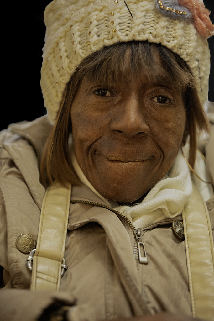 Pete, I agree with our colleagues. This is a thought-provoking portrait of a woman with a lot of character. Rather than suggest that you adjust skin tones and corrections for a magazine cover, I would suggest that you work more on the blown highlights around her knit cap. You have a good start.