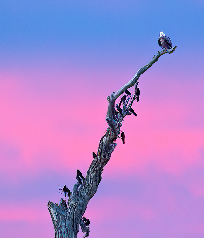 Mike, I can see why you enjoy the composition and soft colors. This is distinctive because of the colors and the great number of other birds on the dead branch. The branch and number of the other birds makes it necessary to not have a close up of the eagle. I realize it is an older photo. I might still suggest that you select the eagle, use Camera RAW filter and adjust the slider to brighten the shadows. This brings out the tones of each feather. I like Topaz DeNoise AI and Sharpen AI. Let me know if this looks better to you. Jim |