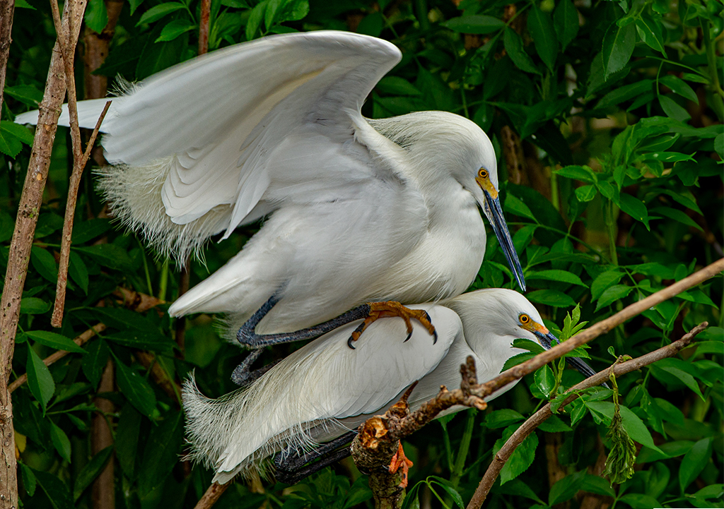Isaac, you got an outstanding photo. I find the details in white plumage are challenging for this dark background. I used the dodge tool in Photoshop to go over the female's wing and the male's body under the wing. Let me know if this brings out more detail. Jim |