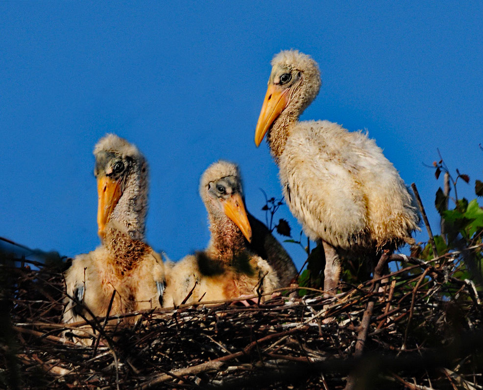 Kathy, this is a great photo of the wood stork chicks. Because the photo was taken in early morning, you have a deeper blue sky and good saturation. I suggest using the dodge tool to lighten the shadows on the middle chick. Let me know what you think. Jim |