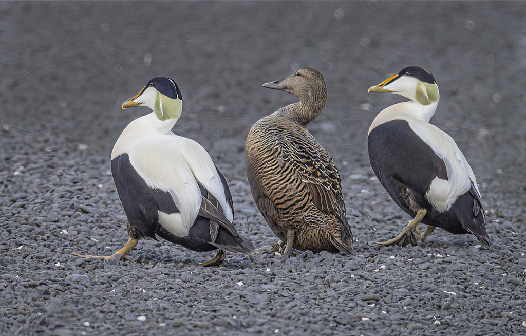 Isaac and Mike, I had another idea for handling the out of focus background. The Eider ducks are very sharp, so darkening the background with the burn tool gives the ducks more separation and puts the background further back. Let me know what you think. Jim |
