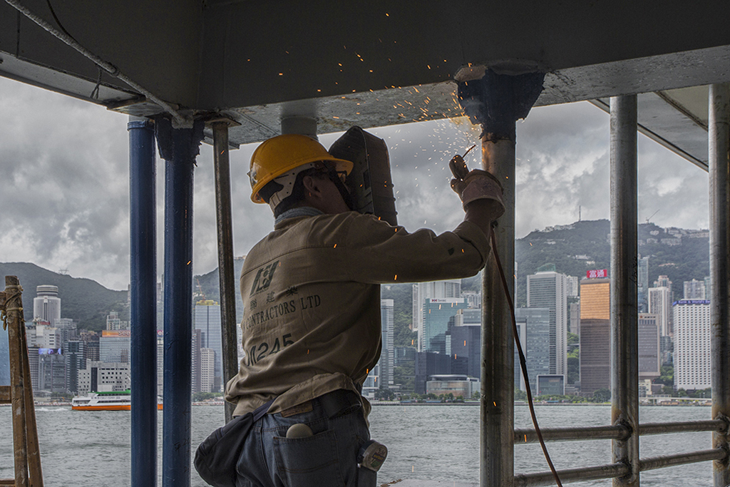 I agree that you have a good eye to have seen the possibilities in this shot. I did a few minor adjustments that might improve its impact. First I straightened the image so that the vertical lines are actually vertical. I did this with the transform/skew tool in Photoshop. I applied two NIK filters to enhance tonal clarity and detail. I also used the hue/saturation tool just to make the yellow helmet pop a bit.
