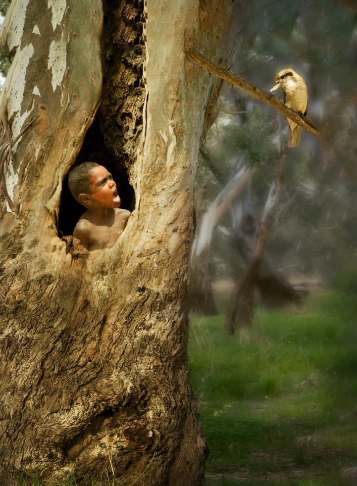 I concur with the comments so far. Jan's rendition is my favorite, though I tried a rendition myself. I wanted to put more space to the right of the bird, and get rid of the overpowering presence of the tree and the green. I used the crop tool, with Content Aware, to take off pixels on the left and bottom, and add pixels to the top and right. Then I used Edit > Fill> Content Aware Fill to clean up the crop fill. After that, I used a Gaussian Blur + a mask to bring back the tree, boy, bird and subtle parts of the grass background. That was followed by NIK Color Efex Pro 2 with Darken/Lighten Center applied several times, to highlight the boy, the bird, and a line in between and also a bit below, to catch the direction of the sun's rays. This was fun! Thank you Christine, for a clever combination of elements in a real story-telling composition! |