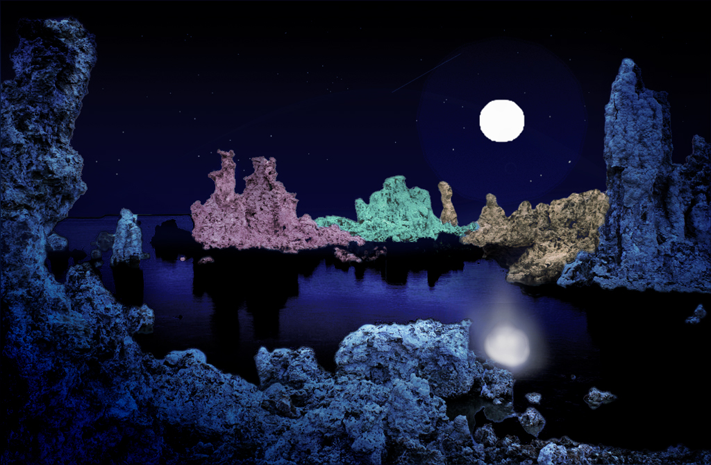 To me, the colors are a bit too bright. In dim light, colors fade and reds fade the fastest. I agree that the salt pillars need some shading, to give dimensionality. The moon's reflection is more irregular, unless the surface of the water is like glass. I tried to enlarge the moon and alter the reflection and position, plus add some shading and dim the vibrance a bit. I used NIK Color Efex Pro, with the Graduated Neutral Density, to add shading. I added several of the those same preset layers, rotating each layer to a different side, and then saved the NIK filter and used a layer mask with partial opacity of the brush, to bring back the lighter colors lit by the moon. I selected the moon and its reflection, copied and pasted to another layer, and then enlarged the moon and moved it and the reflection separately. To add a moon glow, I used the Layer > Layer Style > Outer Glow and fiddled with the settings until I got the effect I desired. The moon required a bit of a leading light path, so I coped the reflection layer and distorted it, and then lowered the opacity of that layer. To add a bit of distortion to the reflection of the moon, I used Filter > Liquify > Forward Distort Tool. The whole process took a lot of fiddling, but eventually got to a stopping point for me!