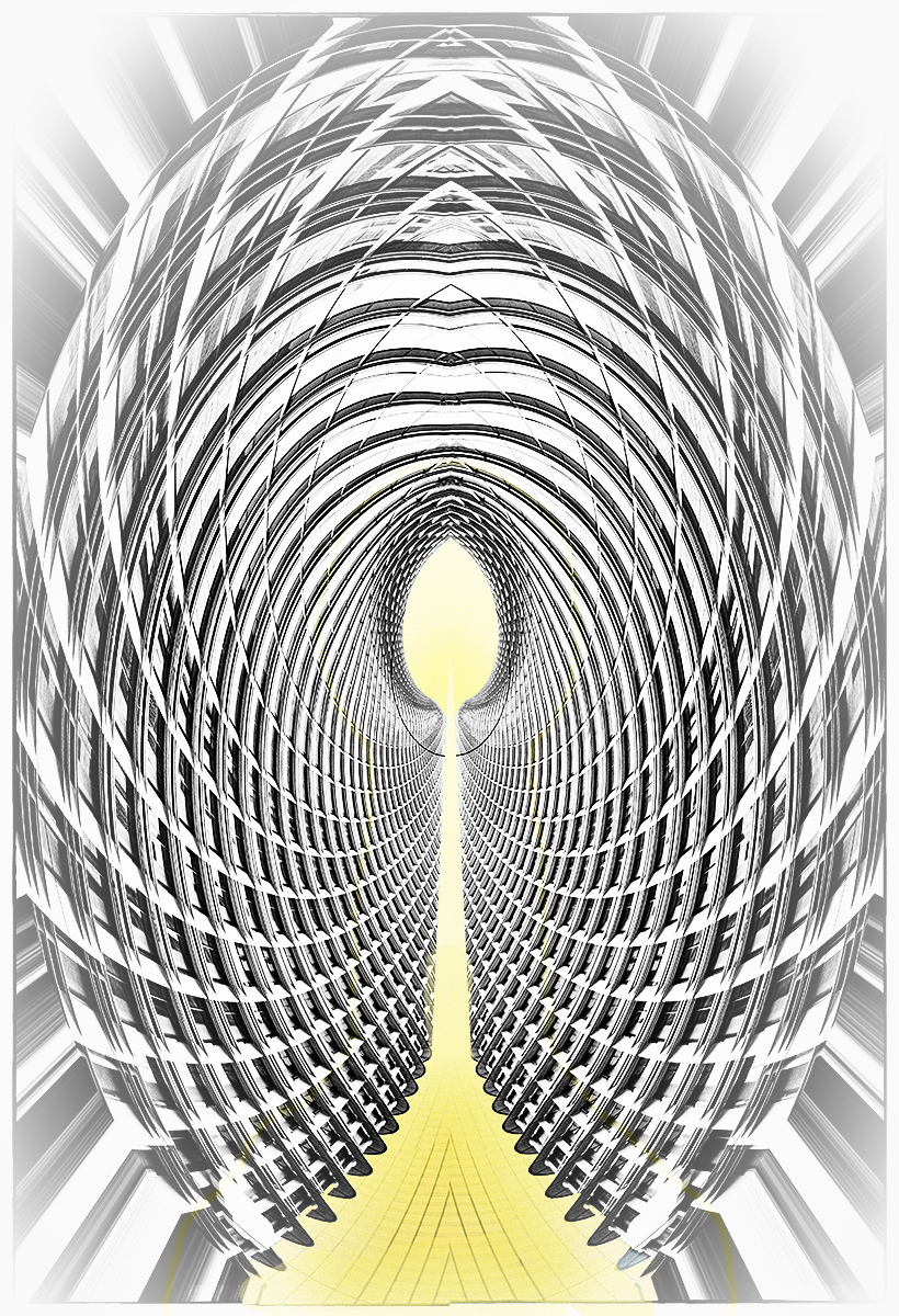 This is a clever idea, with a pleasing geometric result. When I look at your title, I want to see a bit more, something that would lead me into the path of the 'yellow brick road'. So, with a focus on traveling that road to the distant/infinite glowing center, I made some adjustments. First, I duplicated the image and applied a Darken/Lighten Center and a Vignette Blur, to emphasise the center and shift the sides a bit out of focus. Then I selected a Layer > Layer Style> Inner glow and Outer Glow, with a yellow glow. Following that, I applied two Adjustment Layers: Solid Color (with same yellow), and Vibrance. The yellow on the brick road was not gradually changing enough, so I selected the yellow and painted on the path, with a 45 percent opacity, until the change in tone from front to center was more gradual. To me, the intent of the title meant that one needed to have a more gradual movement toward the main focal point in the center and a de-emphasis on the foreground part of the geometry. |