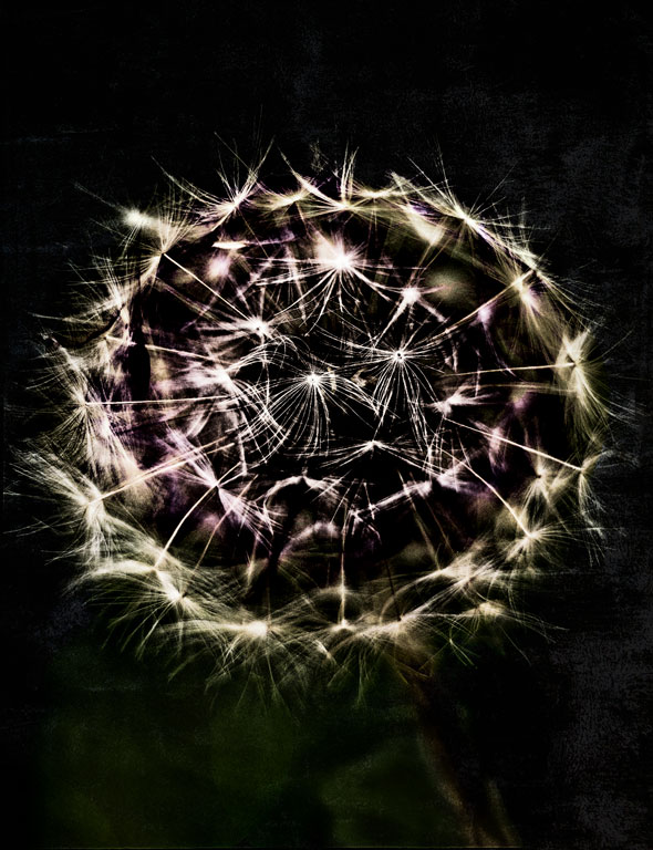 To develop an alternate (for me), I took the image into NIK Color Efex Pro 4 and applied an infrared preset. Then I merged up and applied SilverEfex Pro preset: Wet Rocks with a blue filter. To give some additional interest to the black background, I copied the top layer and applied Topaz Labs Texture Effects 2: Grunge Punch. A mask on that layer was used at 100% opacity to reveal the flower, and 40% opacity to reveal more of the stem and lower left green. |