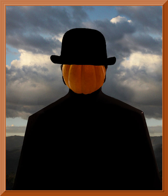 I enlarged the pumpkin and distorted it upward and inward at the sides. Then I cut out the hat and placed it over the top of the pumpkin, filling in the missing part of the hat with black. |