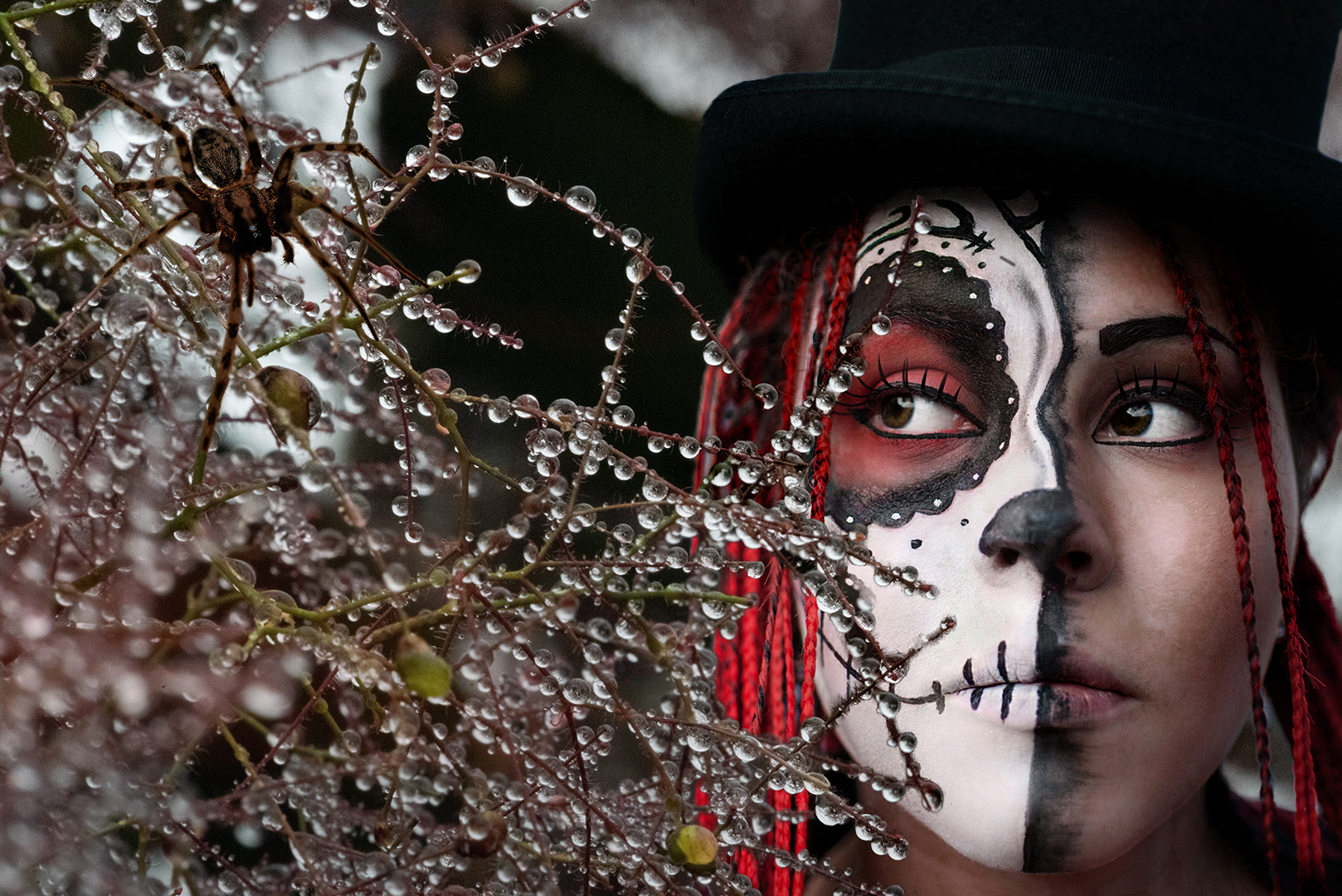 Something bothered me about the entire image, so I decided to play with it. Turns out that what bothered me was the luminescence of the Goth was too equal to that of the web, so that the image lacked dimensionality. So I put a BW adjustment layer over it, set that layer to a blending mode of Luminance, and slid the red and yellow layers to the left, to darken those colors only (in the skin). I inverted the layer mask to black and painted white over the Goth's face. That changed her luminescence to a lower level, to give more an illusion of depth to the image. |